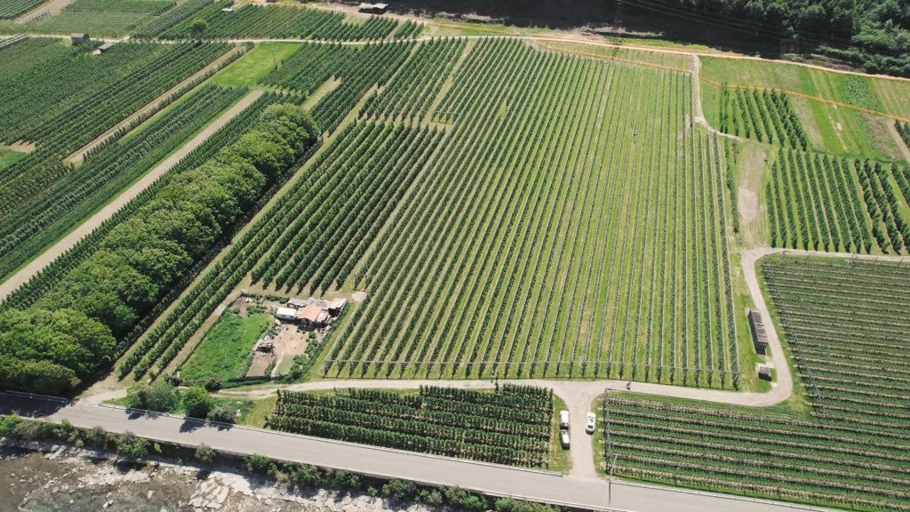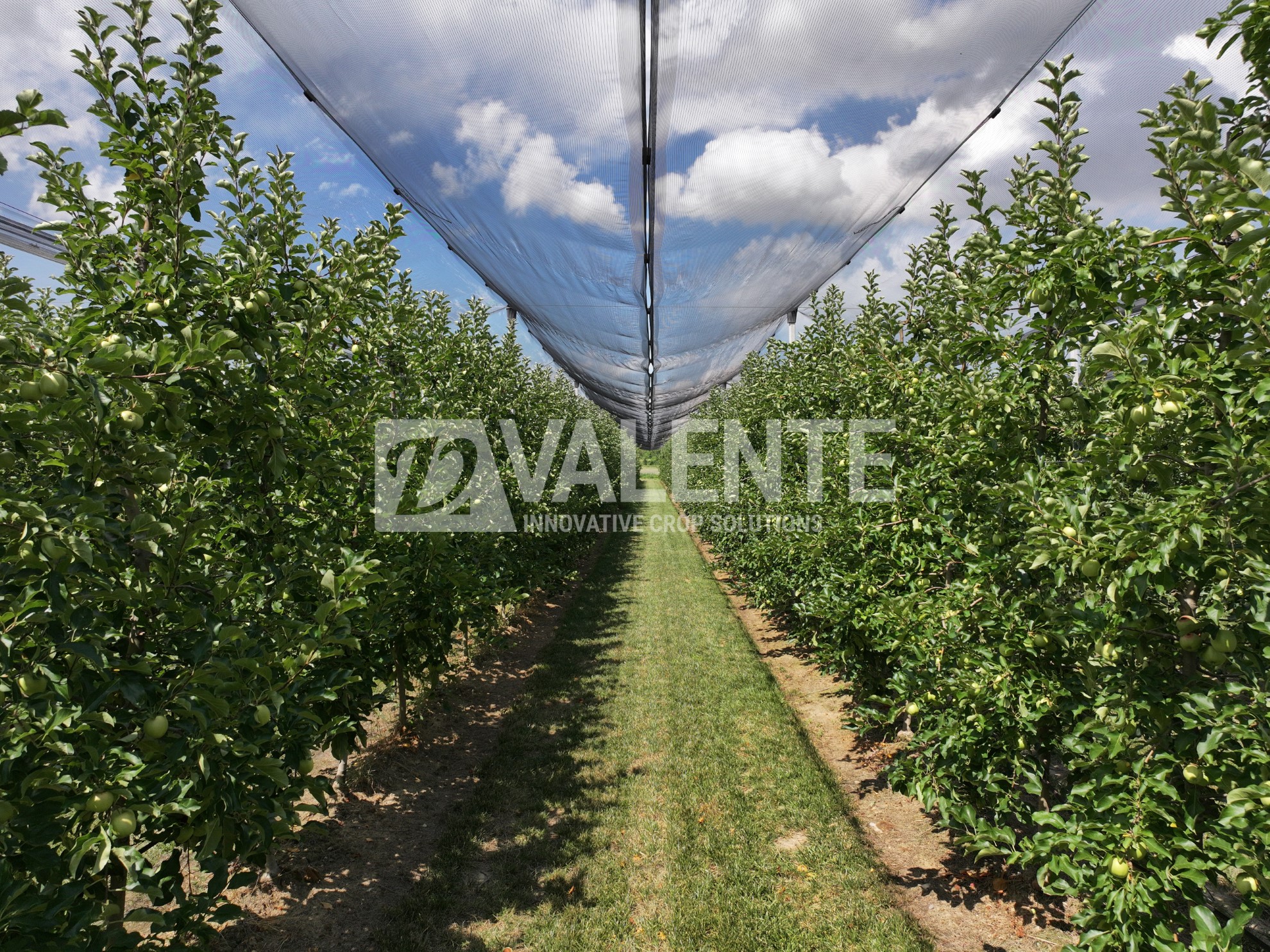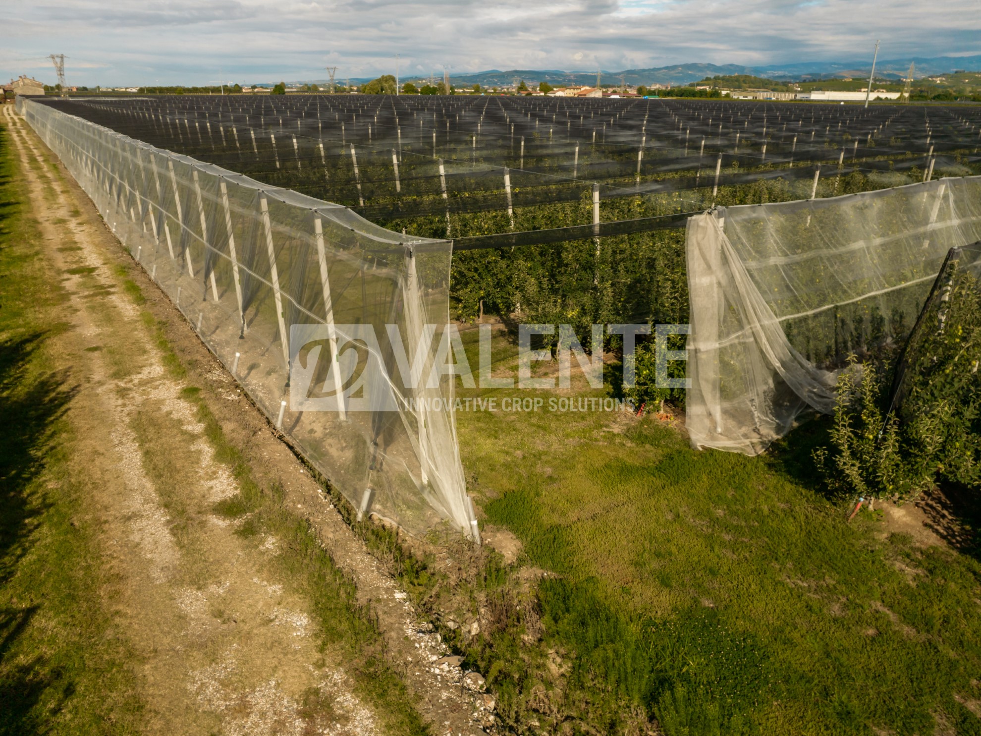 This system uses protective anti-hail netting designed to shield orchards from severe weather.