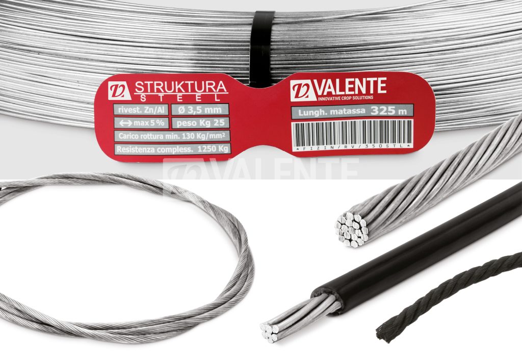 STRUKTURASTEEL steel wire is made of high-carbon steel (greater than 0.6%) coated with a zinc-aluminum alloy. It is drawn in diameters ranging from 1.60 to 4.00 mm and is used to connect all intermediate posts, providing support for plants and securing branches. It is also used to connect the ends of posts when covering them with a covering material, such as hail netting.