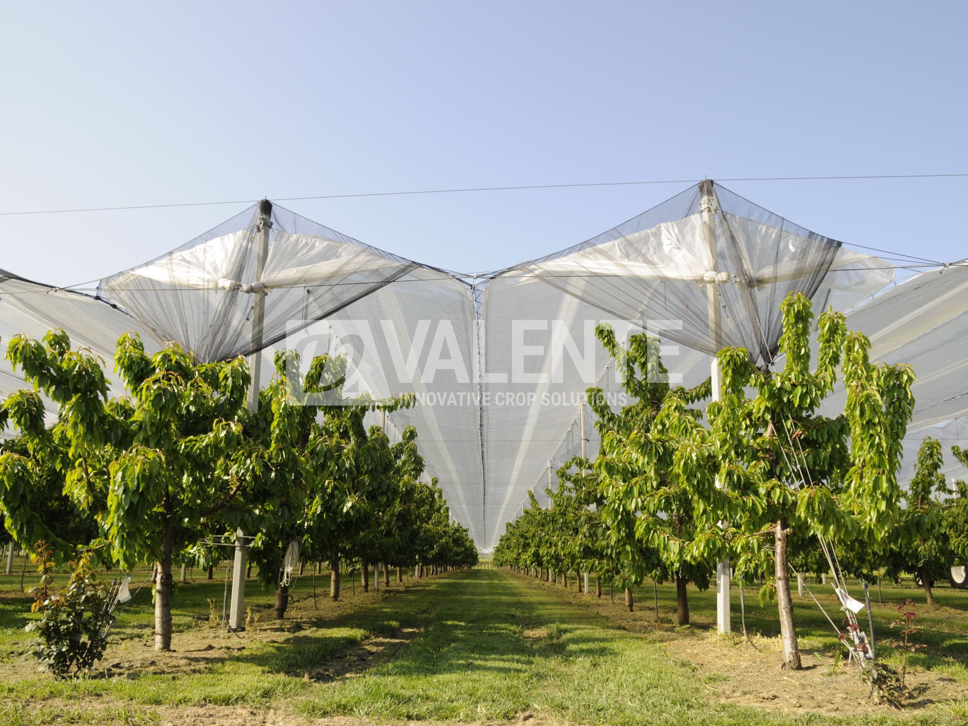 This system uses protective anti-hail netting designed to shield orchards from severe weather.