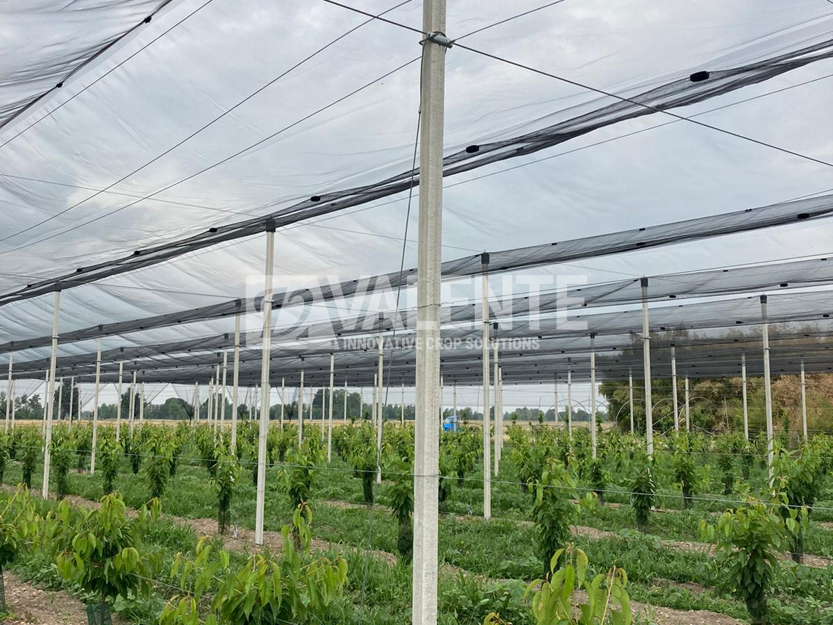 Anti-hail netting is installed on this structure to fully cover orchard rows, protecting them and withstanding even severe weather.