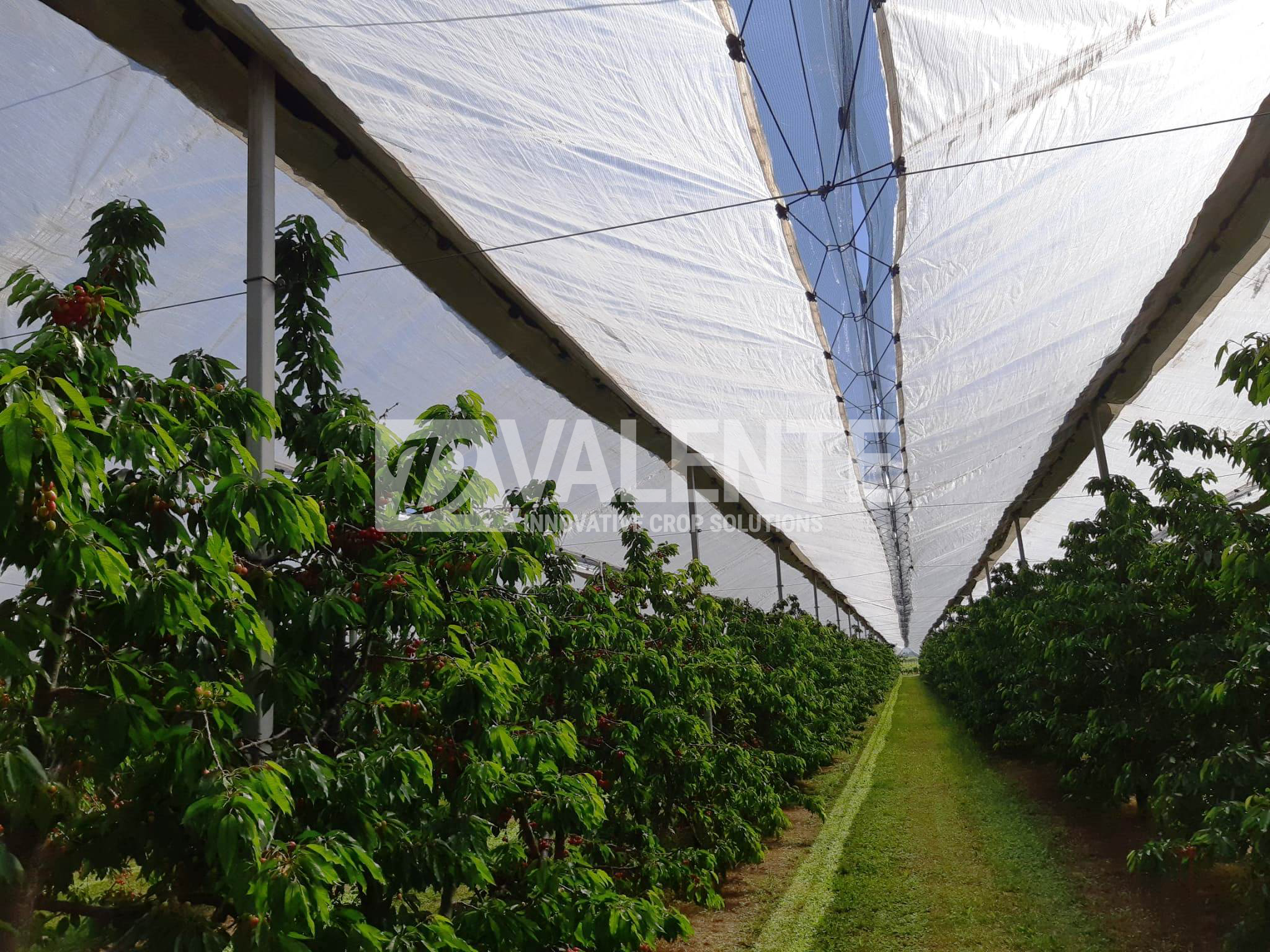 An anti-rain fim is installed on this structure, covering the entire cherry orchard and protecting it in case of bad weather.