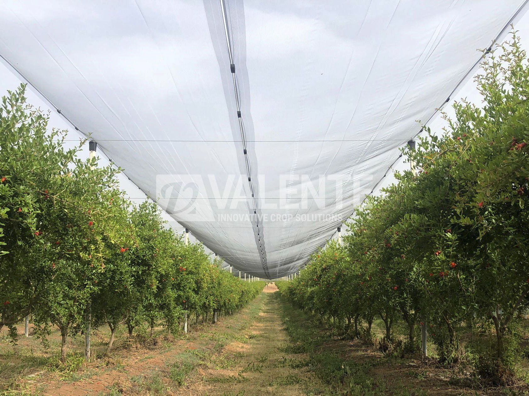 This system uses protective anti-hail netting designed to shield orchards from severe weather.