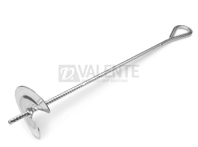 Anchor is then placed in the ground (hole should be preventively prepared) and covered. The twisted eyelet is left above the ground and used to anchor wires or cables of orchards head piles.